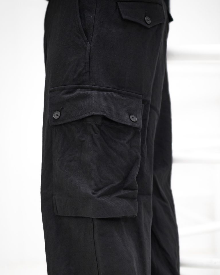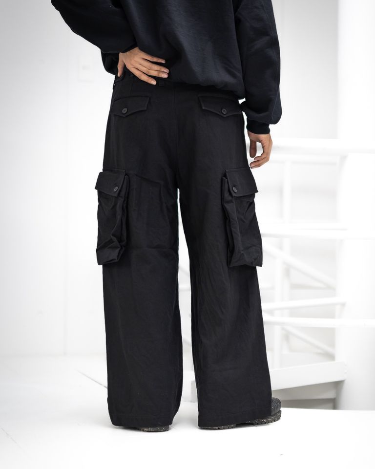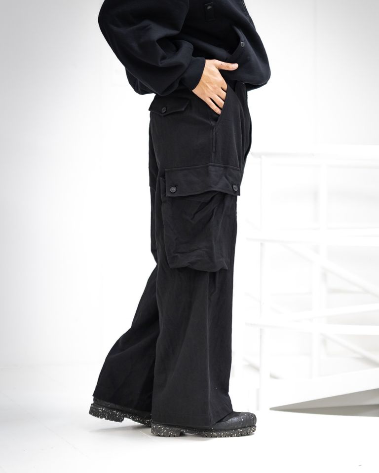 ミリタリーパンツをベースに、深い股上とワタリにゆとりを持たせたワイドシルエットに再構築。動きに合わせて自然と丸みが生まれる立体的なラインが特徴です。カーゴポケットやフラップなどのディテールはしっかりと残しながら、素材とバランスでモードな空気感へと昇華。